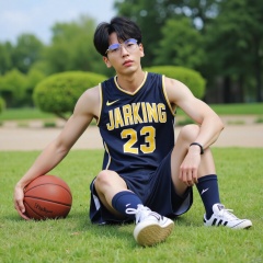 Boy wearing glasses and basketball uniform sitting on the ground, leaning back, very handsome, with basketball next to him, grass, sunshine, photo style, film style, dynamic perspective,KZH