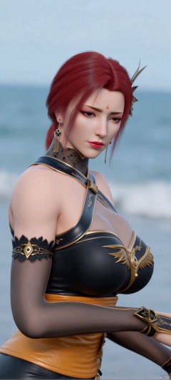 (high definition, Best quality, masterpiece, 4K, exquisite skin), YaFei, 1girl, solo,cleavage, seaside, (cowboy_shot), learning forward