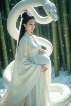 Pregnant woman in flowing white Hanfu dress, serene expression, gently cradling her belly. Soft, ethereal light illuminates her figure, emphasizing the delicate fabric and smooth skin. Large, white snake gracefully arches above her head, creating a sense of mystery and connection. Lush bamboo stalks form the background, casting subtle shadows and providing a natural backdrop that accentuates the figure. The image’s color palette features soft creams and muted greens, suggesting a tranquil, almost dreamlike atmosphere. Gentle, diffused natural light creates a soft, romantic mood. Portrait style, Asian aesthetic, delicate details, traditional Chinese attire. Focus on the pregnant woman and the snake, medium close-up shot, shallow depth of field. Silk-like texture, flowing fabric, graceful pose, calm and peaceful feeling.