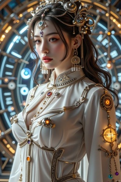 (full body), Girl, dramatic lighting, white Mech, Honey Mech, right on camera, full body shot,(Masterpiece, Top Quality, Best Quality,(White and plump super breasts leaked from the chest of clothes),(huge breasts:2.79),(full breasts:1.99)full_body, Official art, Beauty and Aesthetics :1.2), (1 girl), Extreme Detail, (Fractal art :1.3), colorful, highest detail.,Tech Indian