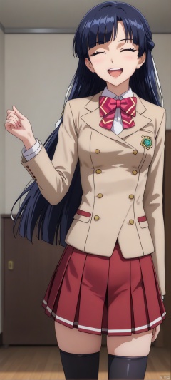 (high definition, Best quality, masterpiece, 4K, exquisite skin), LMyexiao, solo, happy, pleated skirt, red skirt, black thighhighs, thighhighs, room, learning forward