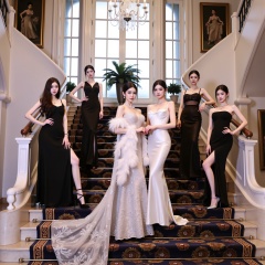 This is a high-resolution photograph of five women posing elegantly on a grand staircase in an opulent, luxurious setting. The staircase is adorned with intricate, dark blue and gold carpeting, and the walls are adorned with ornate wallpaper. The women are dressed in elegant evening gowns, with the woman on the far left wearing a floor-length, off-the-shoulder black gown with a slit, and the woman on the far right wearing a sleek, form-fitting black dress. The woman in the center is wearing a stunning, off-the-shoulder, white gown with a long train and a large, white feather boa draped over her shoulders. Her gown is adorned with intricate, sparkling silver embroidery. The staircase is flanked by a chandelier hanging from the ceiling, and a large window behind the group allows natural light to flood the scene, enhancing the grandeur of the setting. The women are positioned with one standing on each step, creating a sense of symmetry and elegance. The photograph captures the sophistication and glamour of an elegant event, possibly a formal occasion or a fashion show.<lora:紫色韵味FLUX:1>