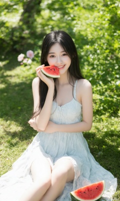 18yo Japanese girl, long straight black hair, wearing a light summer dress, sitting in a sunny garden, holding a slice of watermelon with a joyful smile, surrounded by lush green plants and vibrant flowers, the atmosphere is fresh and lively, capturing the essence of a bright summer day, the sunlight casting a warm and natural glow on her skin,