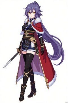 (white background:1.2),looking at viewer,(SOLO:1.4),outline,simple background,(((full_body))),fu_hua, fu_hua cgver, bangs, hair between eyes,jewelry,yellow eyes,ponytail,purple hair,earrings,boots,chinese clothes,black gloves,black thighhighs,cape,white fur trim,obi,tassel,red cape,black print kimono,gold trim,pants,long hair,bangs,hair between eyes,hair ornament,grin,earrings,high ponytail,half closed eyes,red eye shadow,holding sword,small breasts,multicolored hair,streaked hair,hair between eyes,bangs,