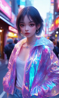 transparent color PVC clothing,transparent color vinyl clothing,prismatic,holographic,chromatic aberration,fashion illustration,masterpiece,girl with harajuku fashion,looking at viewer,8k,