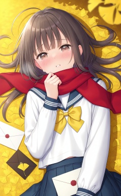 masterpiece,best quality,high quality,loli,1girl,solo,school uniform,skirt,scarf,lying,serafuku,on back,long sleeves,autumn,blue skirt,looking at viewer,sailor collar,bow,brown eyes,long hair,tears,autumn leaves,bangs,blue sailor collar,shirt,parted lips,pleated skirt,white shirt,envelope,ahoge,blurry,red scarf,black hair,crying,leaf,letter,crying with eyes open,yellow bow,outdoors,brown hair,bowtie,ginkgo leaf,from above,tearing up,blush,