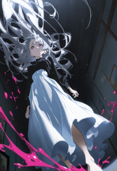 masterpiece,best quality,amazing quality,very aesthetic,absurdres,newest,impactful picture,offcial art,movie perspective,yoneyama mai,cute painting style,dark,girls wearing terrible clothes,long dress drifting in the wind,very long hair flying loose,grey hair,splash ink painting wind,bright colors,dark painting style,from_below,