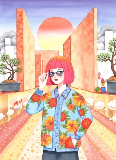 CGArt illustrator,editorial avant-garde dramatic action pose of a woman short pink hair wearing 70s round wacky sunglasses pulling glasses down looking forward, in Tokyo with large marble structures and bonsai trees at sunset with a vibrant illustrated jacket surrounded by illustrations of flowers, smoke, flames, ice cream, sparkles, rock and roll