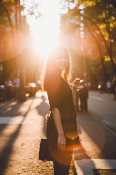 film grain,Asian girl,Teenage girl smoking,YKF_backlit,Backlit silhouette photography,liangyi san,Warm golden light of sunset casting long shadows, street photography, a young girl walking down the center of a bustling street, her bright smile illuminated by the soft, warm glow of the setting sun, gentle lens flare and bokeh effects, vibrant city life in the background.,light master,
