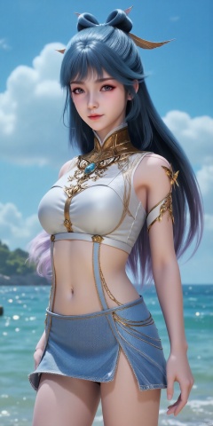 ,(Good structure), DSLR Quality,Short skirt,Blue sky, white clouds, ocean,((Surf)), nai3, 1girl, solo, crop top, , choker, navel, shirt, midriff, crop top overhang, looking at viewer, white shirt, jewelry, breasts, bare shoulders, off-shoulder shirt, off shoulder, black choker, thighs, stomach, long hair, bracelet, short sleeves, ribbon, hand up, collarbone, hair ribbon, medium breasts, , bra strap, , hair ornament, thigh gap, necklace, expressionless, , ,,wangdonger