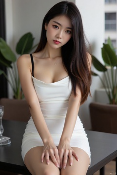 1girl,solo,sitting,strap dress,flesh colored pantyhose,Luminous pantyhose,panty_shot,looking at viewer,outdoors,masterpiece,realistic,best quality,highly detailed,highres,plns,vicky,