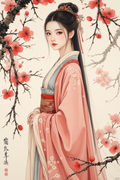 A poised young woman in elegant Hanfu, standing amidst a blossoming plum orchard in springtime. The blossoms are depicted with delicate brushstrokes, contrasting with the strong lines of her flowing robes. Her expression is serene and contemplative, her gaze directed towards the viewer. The style should be reminiscent of classical Chinese court painting, with a focus on refined elegance and delicate detail. The ink washes should be subtly varied, creating depth and texture in both the clothing and the blossoms. The overall mood should be one of gentle beauty and quiet contemplation. Include details such as the delicate embroidery on her clothing and the gentle breeze rustling through the branches.
