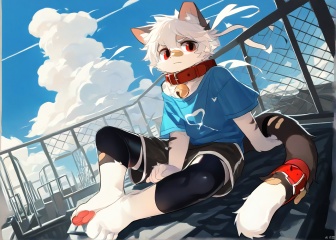cat boy,1boy,solo,male_focus,(white_hair:0.8),red eyes,[bell on collar,Collar,Cortical collar,Large collar],(blue t-shirt,black_leggings under shorts,black bike_shorts),(barefoot) BREAK dutch angle,vanishing point,sitting on rooftop,(blue sky,cloud,wind),(masterpiece, best quality:1.1),foot focus,bandage on nose,bandage on leg,Tail decoration,cat tail,PVC Style,bare_shoulder,body fur,furry,Akira