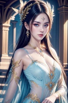 extremely detailed, 1girl, solo, long hair, jewelry, hair ornament, necklace, original, dress, looking at viewer, feathers, pale skin,