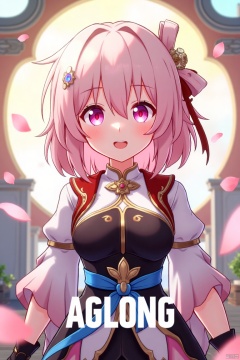 A dynamic movie poster showcasing a solo girl with short pink hair, bangs, and a cheerful smile. She wears a hair ornament, long sleeves, and fingerless gloves, all in a Chinese-inspired outfit. Pink petals float around her, adding a whimsical touch. The scene is framed with soft, warm lighting, highlighting her joyful expression. At the bottom center, the text AGlong is prominently displayed.