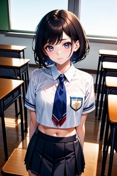 1girl, solo, skirt, black hair, looking at viewer, white skirt, classroom, navel, indoors, shirt, desk, white shirt, short hair, chair, midriff, school desk, school chair, school uniform, pleated skirt, crop top, short sleeves, arms behind back, closed mouth
