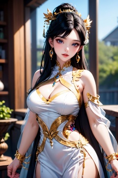 1girl, jewelry, solo, dress, white dress, earrings, long hair, breasts, black hair, clothing cutout, blurry background, hair ornament,
