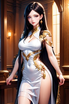 1girl, jewelry, solo, dress, white dress, earrings, long hair, breasts, black hair, clothing cutout,