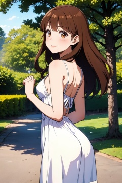 1girl, solo, outdoors, dress, long hair, smile, looking at viewer, white dress, blush, brown eyes, brown hair, breasts, ass, looking back, closed mouth, tree