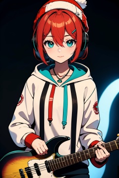 1girl, solo, instrument, guitar, hood, hoodie, beanie, necklace, hat, jewelry, holding, looking at viewer, hatsune miku, red headwear, white hoodie, electric guitar, holding instrument, headphones, red hair, short hair, hair ornament, hairclip, hair between eyes, closed mouth, alternate hairstyle