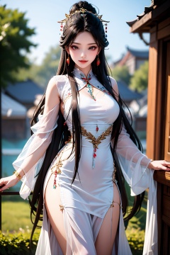 1girl, jewelry, solo, dress, white dress, earrings, long hair, breasts, black hair, clothing cutout, blurry background, hair ornament, chinese clothes
