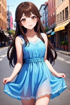 1girl, solo, outdoors, dress, long hair, smile, looking at viewer, blue dress, blush, brown eyes,