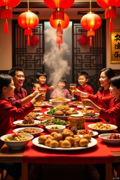 A festive Chinese New Year family banquet scene, set in a warmly lit traditional dining room with red lanterns and gold decorations adorning the walls. The table is laden with an array of traditional dishes, steaming hot and richly colored, surrounded by a family dressed in their holiday best, smiling and clinking glasses in celebration. The composition captures the intimate moment of joy, with the family seated around the table, framed by the vibrant decor and warm lighting, creating a sense of warmth and togetherness.