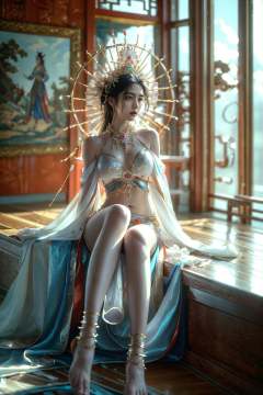 xuer Chinese goddess,1girl,(jewelry,anklet:1.3),solo,(sitting:1.2),(from side,profile:0.9),(wide shot, wide-angle lens,Panoramic:1.2),image,nostalgic paintings,Exotic Style,bull body,long sho,dancing,Martialarts and fairy - like vibe,best quality,masterpiece,Dynamic Angle,Perspective,High Point,pov,<lora:绪儿-中国女神xuer Chinese goddess:0.75>,
