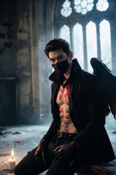 1 boy, xiaozhan,sitting, jacket, wings, pants, indoor, halo, feathers, large environment red, semi-nude upper body, ((black tattoo, with blood stains, black mask, red and black pants 2)), angel, candle, prayer, white feather Film lighting, strong contrast, high level of detail, best quality, masterpiece, white background, , solo, smile, gloves,