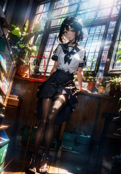 Epic CG masterpiece, an anime girl in a room with plants, no shoes, Black transparent pantyhose, pleated skirt, Sailor suit, sailor collar, in the style of photorealistic urban scenes, applecore, sandalpunk, high-angle, vacation dadcore, solarizing master1girl,  Milky skin, (shiny skin:1.4),silk stockings,<lora:绪儿-阳光少女window:0.8>