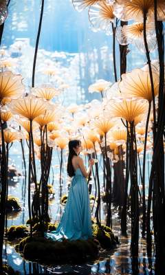 wide shot, blurry background, bokeh,dark, night, depth ffield,(blue theme:1.3),1girl, solo,from behind, facing away,fantasy, water drop,At the seashore, the horizon where water meets the sky, 1 girl, tranquil, cosplay, Mermaid Princess, sitting on a rock, cascading waves, flowing hair, shimmering scales, adorned with seashells, mesmerizing gaze, turquoise eyes, subtle makeup, curvaceous figure, wearing a pearl-studded tiara, flowing sea-blue gown, barefoot in the sand, gentle breeze, seagulls soaring above, golden sunlight, peaceful atmosphere,glowing,flower,holding, outdoors, scenery,reflection, water, ripples, light particles,forest, bare tree, silhouette,<lora:绪儿-梦幻森林:0.95>