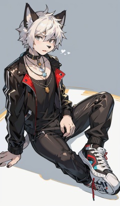 1boy, cat, animal ears, white hair, male focus, sitting, black footwear, jacket, black cat, pants, shoes, jewelry, looking at viewer, necklace, short hair, animal, solo, grey eyes, collar, sneakers, black pants, black shirt, long sleeves, furry,pixel creature