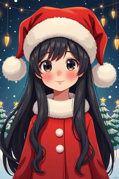That Christmas night, a girl with long black hair, wearing a furry hat, two fur balls hanging on the hat, a black long-haired girl a Santa hat