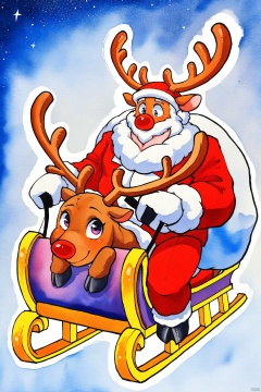 watercolor,A jolly Santa Claus, clad in his iconic red suit, rides a majestic reindeer-drawn sleigh amidst a winter wonderland. The reindeer's antlers and fur glisten with a soft, snowy sheen as they gallop across the night sky, the colorful lights of homes and buildings twinkling below.