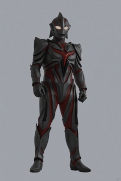 (grey background:1.2),(SOLO:1.4),outline,simple background,(((,standing,looking at viewer,arms at side))),dark_zagi,ultraman,alien,black bodysuit,black gloves,legwear,gloves,boots,cover,mask,plugsuit,armor,bodysuit,black tight-fitting,black footwear,helmet,leather suit,latex,tokusatsu,no humans,science fiction,hard mask,no smile,no eyes,no nose,solo,black rubber bodysuit with red line,black head,red eyes,red pattern on body