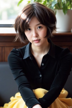 a young woman with short dark brown hair is seated on a black couch. She is wearing a long-sleeved black shirt with a black collar and white buttons. Her left hand is resting on her hip. Her right hand is crossed over her right shoulder. The couch is a dark gray color, and a yellow blanket is draped across the bottom of the couch. In the background, a brown wooden shelf is visible, with a potted plant on the right side of the shelf. The backdrop is blurred, suggesting a sunny day.