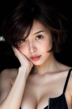 a close-up shot of a young Asian woman with dark brown eyes and dark brown hair stands in front of a dark backdrop. Her face is angled slightly to the left, with her left hand resting on her chin. Her lips are painted a vibrant red, adding a pop of color to her face. Her eyes are a piercing blue, and her lips are a darker shade of red. Her hair is pulled back, framing her right shoulder. She is wearing a black bra with a zipper draped across her chest. Her left hand is draped over her left shoulder. The backdrop is a stark white, creating a stark contrast to the woman's face.