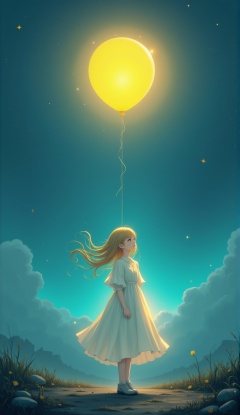 Emotion,fog,dreamy surrealism,an illuminated globe,ethereal light and stars,an ethereal yellow balloon that floats above her