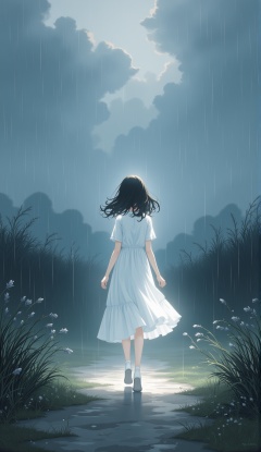 Emotion,A solitary figure in a white dress walks along an ethereal path,surrounded by falling rain and towering grasses under a dramatic sky.,