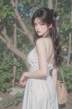 1girl, solo, long hair, breasts, looking at viewer, large breasts, black hair, hair ornament, dress, ass, cowboy shot, looking back, bag, hair bun, from behind, white dress, leaf, back, handbag, backless outfit, branch, backless dress