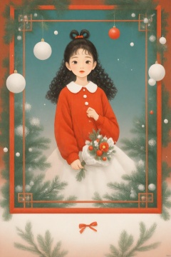A beautiful young lady with long curly hair, wearing a bright red sweater and a beautiful bow hair tie on her head, holds a bouquet of flowers in one hand and stretches her other hand into the air. The young lady is facing the camera, in spring. , Chinese style illustration, character illustration, comic style, solid color background, Christmas Frame Scene