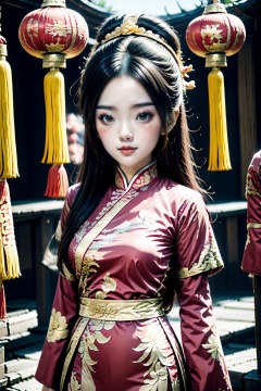 <lora:ChineseNewYear:0.8>, chinese new year, girl, (smirk:0.2), long hair, arms at sides, red chinese clothes, paper lantern,