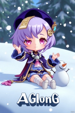 A chibi-style movie poster featuring Qiqi from Genshin Impact, 1 girl solo, full body, sitting on a snowy ground with a snowman beside her. She has long purple hair with bangs, a coin hair ornament, and a qing guanmao hat. Qiqi is wearing a purple jacket with wide sleeves, a cropped jacket, thighhighs, shorts, and a bead necklace. She has bandages on her leg, purple eyes, and is looking at the viewer with parted lips and blush. The scene is illuminated by falling snowflakes, with a three-dimensional text AGlong in the middle below, surrounded by a poster theme. The composition highlights her jewelry, ofuda, beads, and white thighhighs, set against a snowy backdrop.