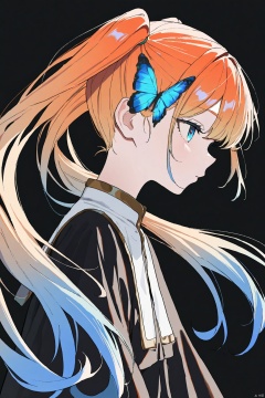 1girl, solo, profile, long hair, simple background, black background, bug, upper body, orange hair, blue eyes, butterfly, multicolored hair, blue butterfly, bangs, from side, gradient hair, twintails