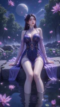 Aiming, DSLR quality, depth of field, at_viewer, dynamic poses, rich expressions, friendly smile, 1 girl, 8k resolution, masterpiece quality, high details. Shot from below, low angle shot, fantasy theme, cropped. {(1 girl: 1.5), alone, long hair, black hair, wearing hair accessories, wearing a dress, sitting, full body, her huge breasts can barely be contained by the clothes, (closer to the audience: 1.8), (see Looking at the audience: 2), beautiful face, ((worm-eye shot: 1.2)), perspective distortion}, (panoramic, fisheye lens effect: 1.1). {(Strong backlight, underexposure: 1.4), (Occlusion shadow: 0.8), Depth of field (100mm focal length: 1.2)}, (Horizontal line: 0.7), low-key earth. The feathers of the starry sky blend into the background, creating a sense of depth and gradient color. Combined with the Droste effect (endless repetition and reflection: 1.2). Show legs, long legs, beautiful legs. Pond, night, lotus leaves, lotus flowers, huge celestial bodies, deep blue atmosphere. Surrounded by fluttering petals, reflecting or casting dramatic shadows and highlights, {(Meteor Shower, Planets: 1.1), (Comet Vermilion: 1.3)}. Mesmerizing effect, dreamy atmosphere. The background is blurred, the swirl of petals, the swirl of stars.