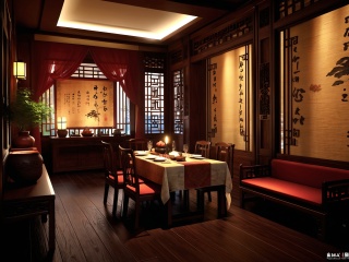 Restaurant,indoors,(deep tone lighting:1.2),(red:1.6),table,chair,(dark floor:1.4),no humans,Cultural stone wall,wine,plants,(night:1.8),elegant interior,dim tone light,masterpiece,best quality,Silk Curtains with Calligraphy,beautiful rendering of the Tang Dynasty,extremely detailed,deep chestnut res,3ds max,8K,