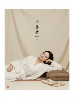 This is a photograph featuring a woman reclining on a mat in a minimalist, serene setting. The woman, with fair skin and dark hair, is dressed in a traditional, flowing white robe that drapes elegantly around her body. She is lying on her back, propped up on her left elbow, with her right hand gently touching her chin, giving a contemplative, relaxed expression. The background is a plain, light beige fabric, providing a soft, neutral backdrop that enhances the simplicity and tranquility of the scene.To the right of the woman, there is a traditional Japanese-style cushion with a woven texture and a patterned mat beneath her. On the mat, there is a scroll with kanji characters, adding an element of cultural significance. The overall color palette is muted, with earthy tones and subtle hues, creating a calming, meditative atmosphere.The photograph is framed by a white border with traditional Chinese characters and a small, elegant red seal at the bottom. The characters are in a delicate, calligraphic style, enhancing the aesthetic and cultural context of the image. The composition and lighting are carefully chosen to highlight the serenity and introspective nature of the subject.