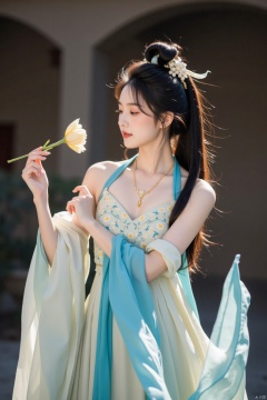 a beautiful Asian woman stands with her back to the viewer. She is dressed in a flowing flowing dress, adorned with a blue sash and a gold necklace. Her hair is styled in a ponytail, adding a touch of beauty to her outfit. The woman's hair is pulled back, cascading down to her shoulders. She holds a pale yellow flower in her left hand, her right hand is wrapped around the stem of the flower. The backdrop is blurred, creating a stark contrast to the woman's dress.