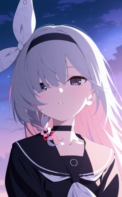 masterpiece,best quality,high quality,loli,1girl, plana (blue archive), solo, sky, hairband, hair over one eye, choker, black hairband, black eyes, long hair, colored inner hair, black choker, sailor collar, multicolored hair, braid, black sailor collar, star (sky), pink hair, serafuku, school uniform, red pupils, single braid, cloud, white hair, starry sky, night sky, looking at viewer, white ribbon, night, parted lips, portrait, cloudy sky, outdoors, side braid, white bow, ribbon, two-tone hair, black serafuku, grey hair, collarbone, hair ribbon,<lora:BA3——【Illustrious】hans:0.88>,