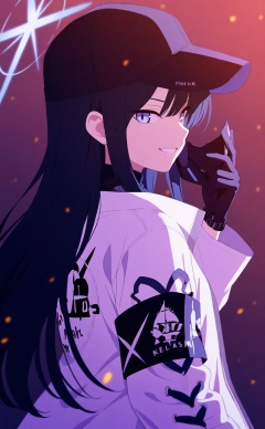 masterpiece,best quality,high quality,loli,1girl,saori (blue archive),solo,mask,holding mask,halo,hat,gloves,jacket,white jacket,blue eyes,baseball cap,long hair,black headwear,black hair,black gloves,looking at viewer,holding,black mask,unworn mask,long sleeves,upper body,smile,mouth mask,looking back,armband,from behind,grin,embers,<lora:BA3——【Illustrious】hans:0.88>,